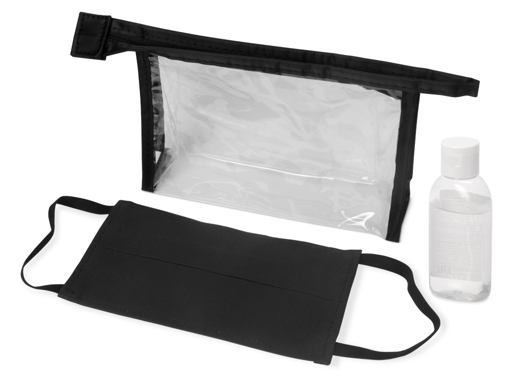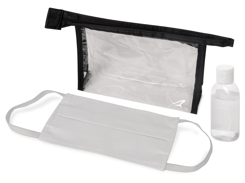 Самое необходимое всегда под рукой - в любом месте и при любой ситуации. Многоразовая хлопковая маска черного цвета и антисептик в стильной пластиковой косметичке поместятся в любой сумке. Бесплатное нанесение осуществляется только на одном предмете.