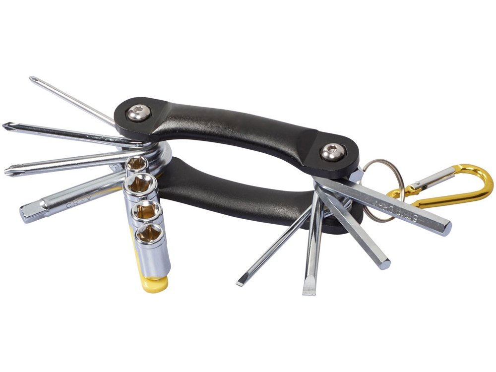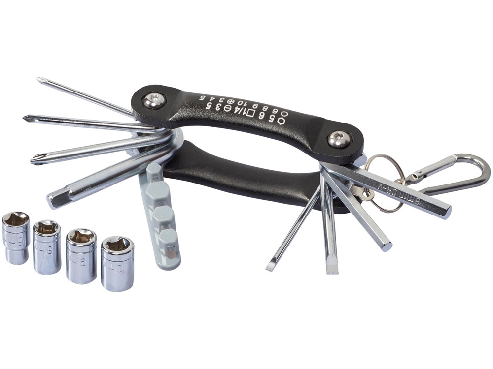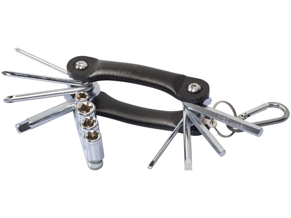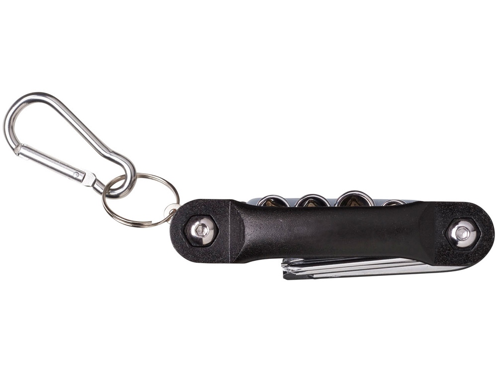 Многофункциональный инструмент Tycoon, 12 функций. 12-тифункциональный складной инструмент. 3 насадки-отвертки Philips, 2 плоские насадки отвертки, 2 шестигранных ключа из карбонной стали с хромированным покрытием. В комплекте держатели с 4-мя насадками и карабин в цвет, который не предназначен для скалолазания. Алюминий. Гравировка (оптоволоконный лазер) (Без чернения) на данный товар осуществляется бесплатно. Оплачивается только настройка оборудования в размере 950 рублей на весь тираж.
