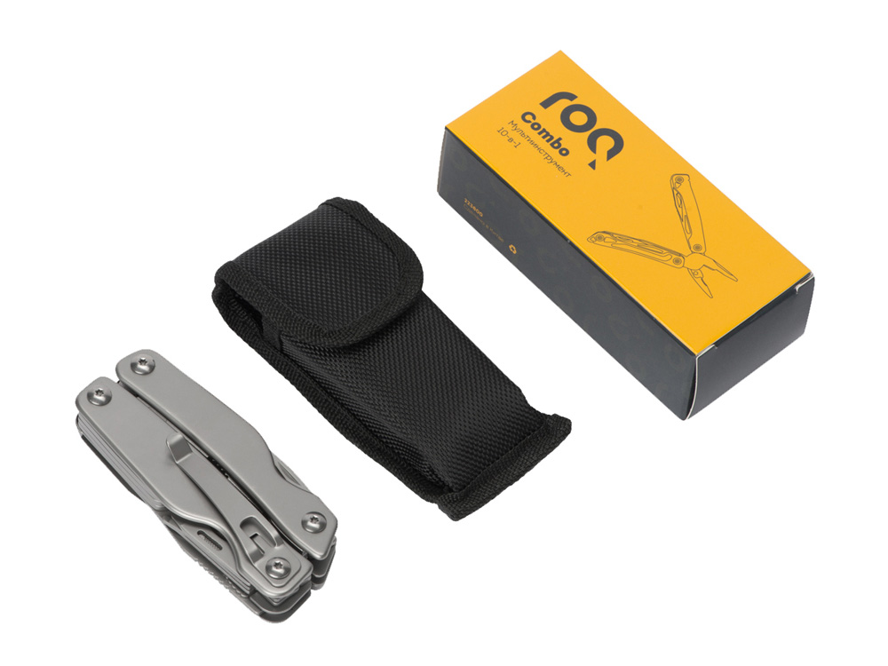 Мультитул-пассатижи Combo бренда roq выполнен из нержавеющей стали. Матовое покрытие позволяет сделать брендирование более заметным. Чтобы не потерять инструмент, его можно прикрепить клипом за ремень или подвесить за складное кольцо. Поставляется в индивидуальной коробке вместе с чехлом.