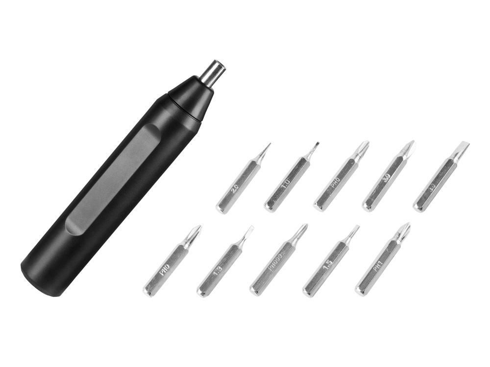 Отвертка-ручка Drill это универсальная отвертка с сменными битами. Благодаря форме корпуса идеально лежит в руке. Отвертка легкая и занимает мало места. Выдвижной механический контейнер бит позволяет хранить в себе весь набор из 10 сменных бит. Ручка инструмента изготовлена из пластика, биты – из нержавеющей стали.