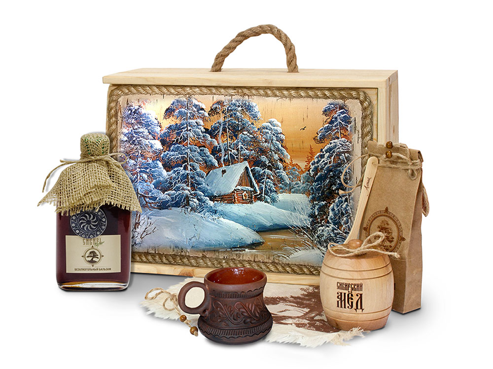 Подарочный набор в уникальном деревянном коробе ручной работы с рисунком на бересте: