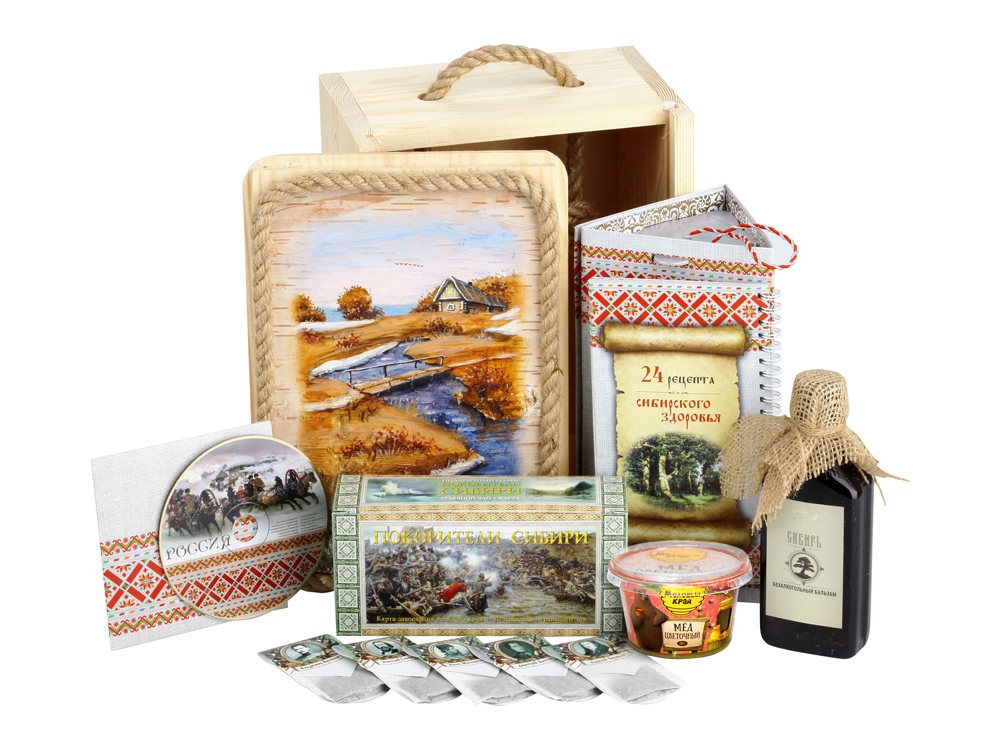 В набор входит мини-книжка с перекидными страницами 24 рецепта сибирского здоровья (внутри упакован безалкогольный алтайский бальзам), чайный набор Покорители Сибири (в коробке - старинная карта России с маршрутами первопроходцев и кратким рассказом об этих походах, и 20 пакетиков травяного чая, на каждом из которых - портреты героев, покоривших просторы Сибири), баночка мёда, диск с релакс-музыкой. Внимание, рисунок на бересте и внешний вид комплектующих в наборе могут отличаться от представленных на фото. Каждый набор авторский.