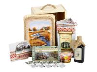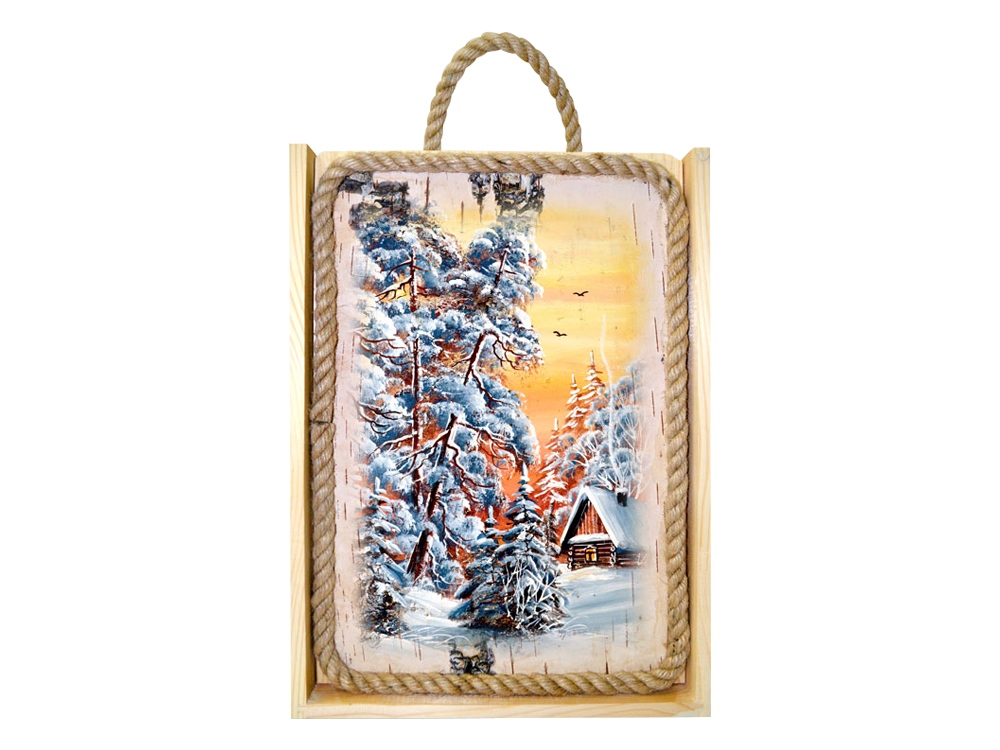 Подарочный короб исполнен из смолистой таёжной сосны. Крышка короба - это оригинальная картина, ручная роспись на бересте. На обратной стороне есть специальные отверстия, чтобы можно было повесить её на стену. Ни одна картина не повторяется, все абсолютно уникальны. На них изображены частицы живой природы - заснеженные таёжные деревушки, сибирские ели в снегу, реки в лунном свете - это настоящая живая Россия.