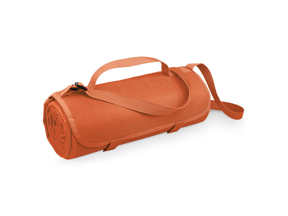 FLEECE. Флисовый плед 160 г/м², Оранжевый. Флисовый плед (160 г/м²) с подкладкой из ЕРЕ, с регулируемым ремнем для удобства переноски. Вид нанесения, рекомендуемый поставщиком: вышивка, трансфер