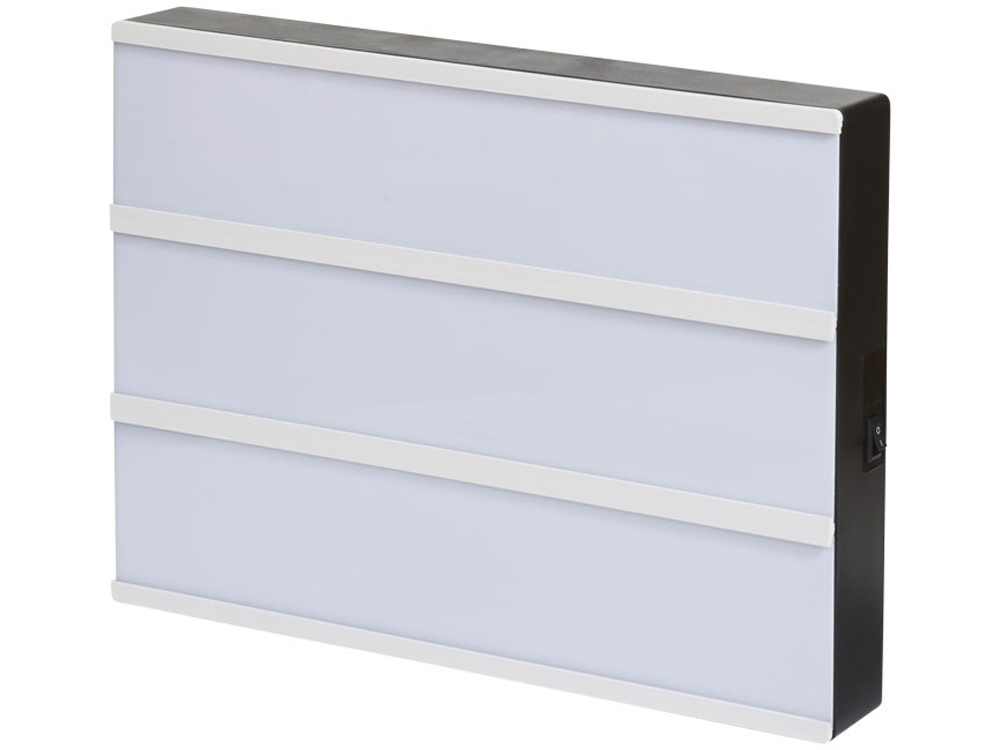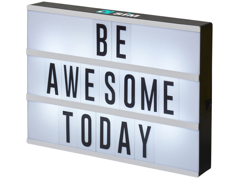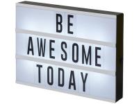 Лайтбокс A4 Cinema. Создайте собственное сообщение с помощью этого декоративного лайтбокса. В набор входит 85 букв и символов. Выключатель расположен сбоку от лайтбокса. Включает 3 батарейки АА и белую подарочную коробку. Рамка из ПП с подсветкой из ПС и белой полоской из ударопрочного полистирола.
