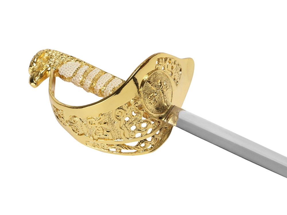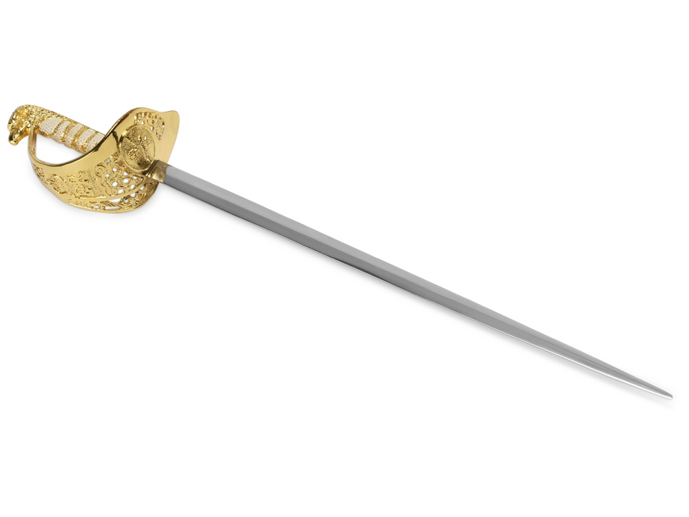 Нож для бумаг выполнен в форме шпаги, привлекает внимание, а его золотистый эфес (ручка) украшен фигурной головой орла и вензелями. Лезвие выполнено из нержавеющей стали, имеет безопасные скругленные края; модель не является холодным оружием, однако в качестве ножа для бумаг выполняет свою функцию безукоризненно.