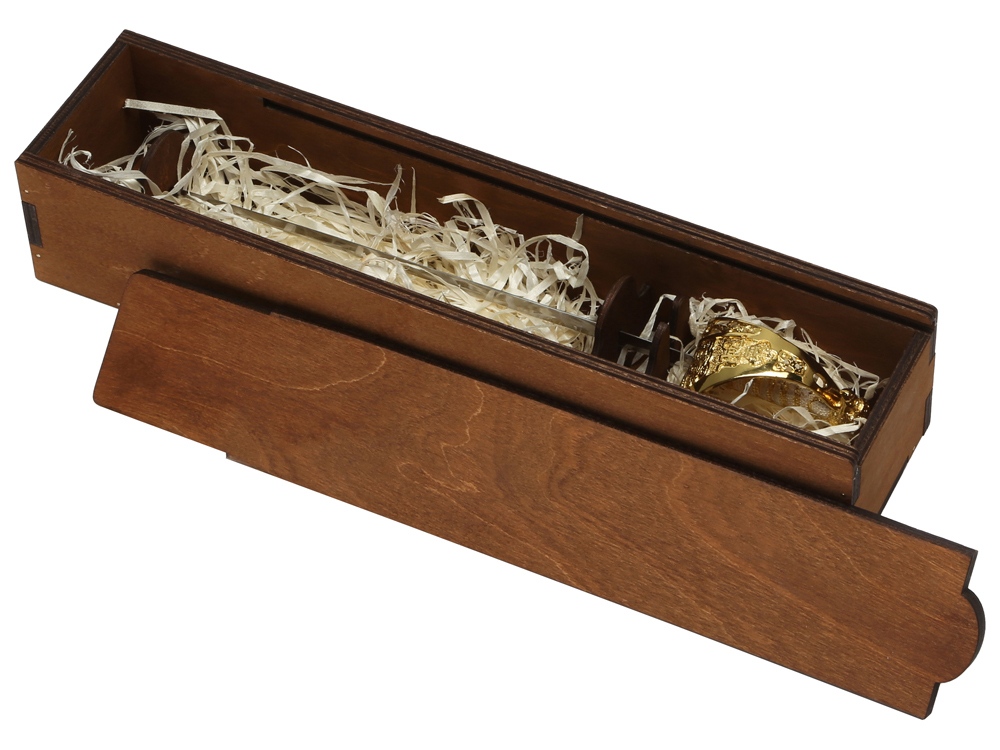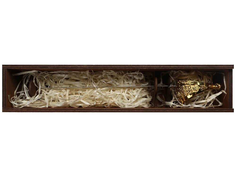 Набор поставляется в деревянном футляре, который достойным образом обрамляет подарок и, может быть, брендирован. Наполнитель и держатели-скобы из дерева, фиксирующие шпагу в одном положении, помогут доставить ее в целости и сохранности адресату, произведя должное впечатление с первого взгляда. Гравировка (оптоволоконный лазер) (Без чернения) на данный товар осуществляется бесплатно. Оплачивается только настройка оборудования в размере 1100 рублей на весь тираж. Сборка товара осуществляется в течение 2-х рабочих дней при наличии на складе.