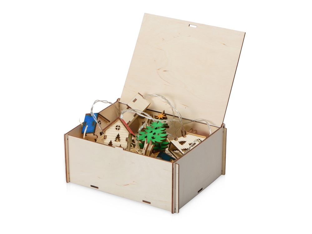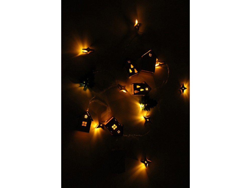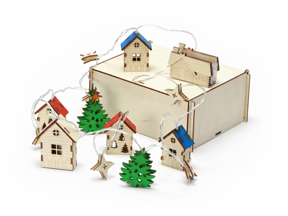 Светодиодная новогодняя елочная гирлянда постоянного свечения с цветными фигурками из натуральной березовой фанеры. Работает от 2-х батареек АА (в комплекте). Упакована в деревянную подарочную коробку со стружкой. Для удобства персонализации стенка одной подвески-домика и отсека для батареек выполнены без перфорации и декора. Сплошная стенка у подвески-домика легко снимается для удобства гравировки. Также Вы можете добавить свой дизайн на крышку подарочной коробки.