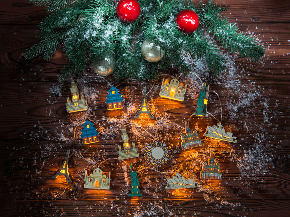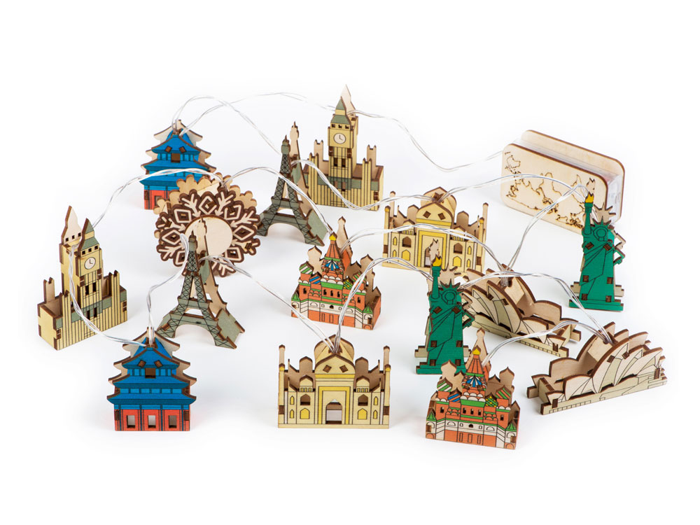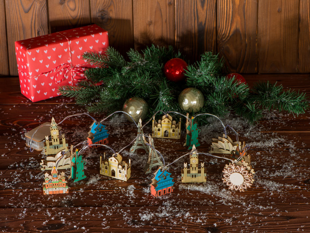 Новогодняя ёлочная гирлянда постоянного свечения с цветными фигурками достопримечательностей из натуральной березовой фанеры сделает процесс украшения ёлки или дома не только увлекательным, но и познавательным!