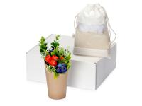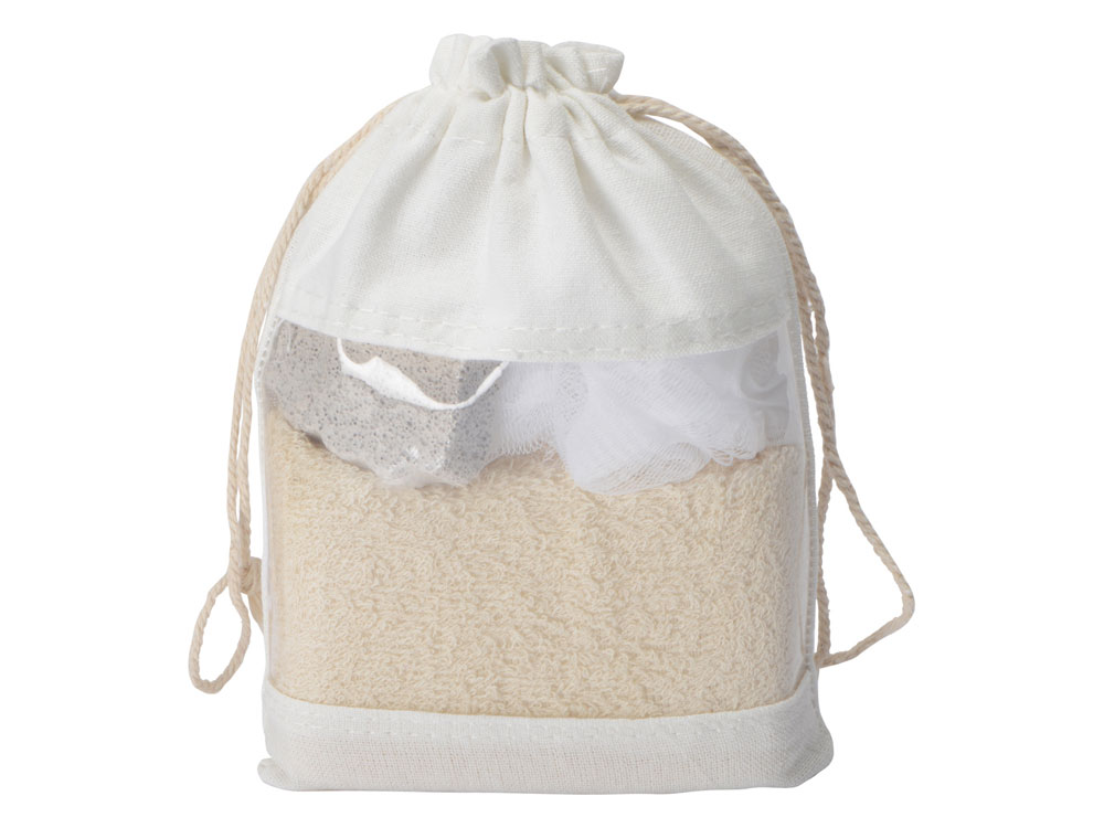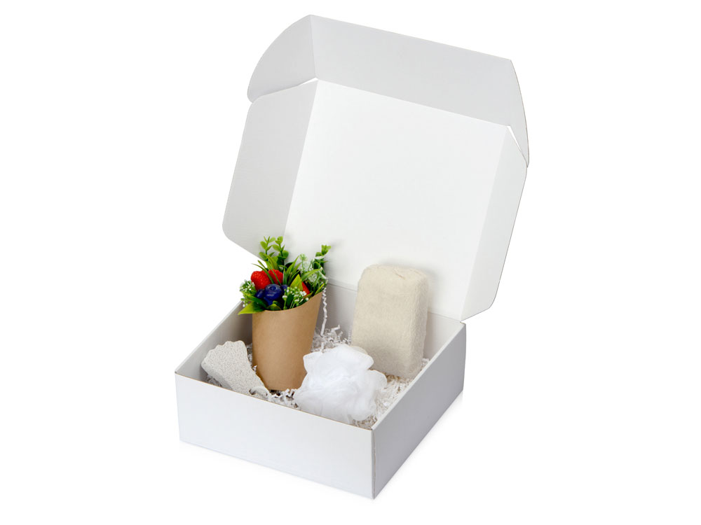 Набор состоит из ароматизированного мыла ручной работы в виде букета и банного набора в мешочке, внутри которого — пемза, губка и мочалка. Набор упакован в белую коробку с белый бумажным наполнителем. Термотрансфер (1 цвет (цветные изделия)) на данный товар осуществляется бесплатно. Оплачивается только настройка оборудования в размере 10000 рублей на весь тираж. Сборка набора осуществляется в течение 2-х рабочих дней при наличии на складе.