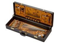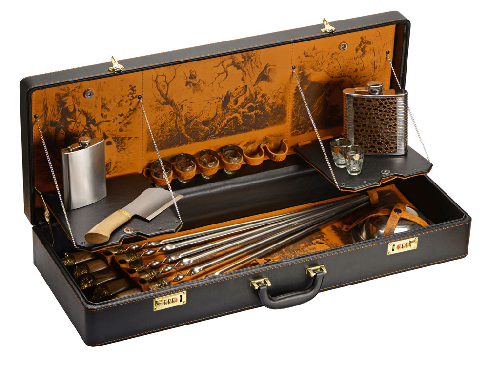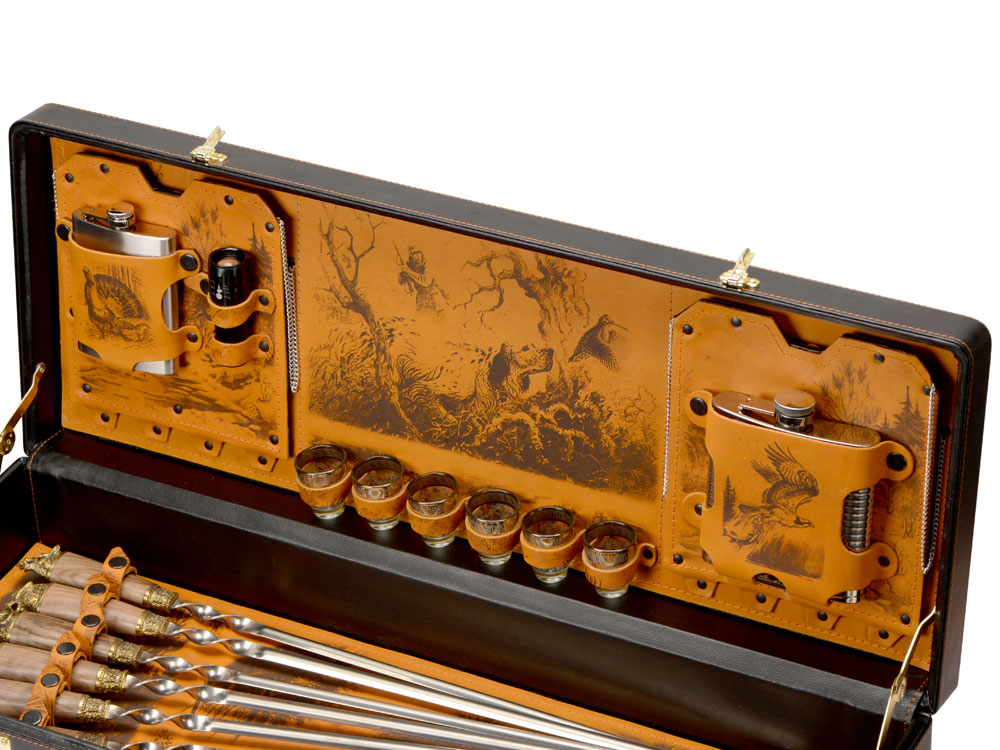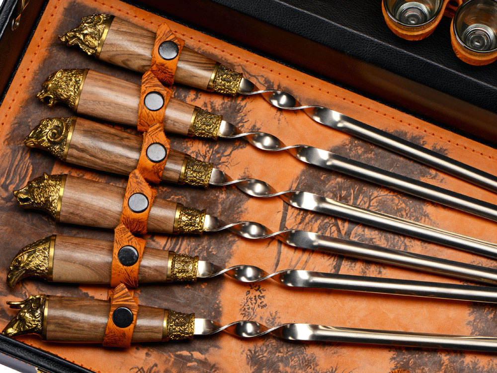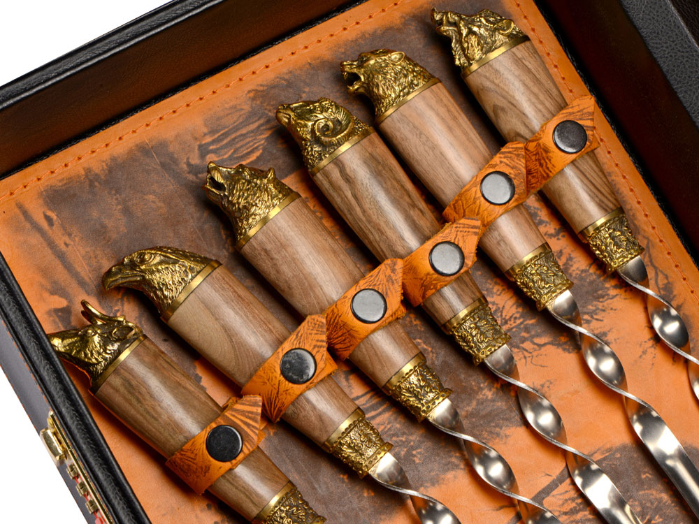 Шампура 670 мм (нерж. сталь) ручка орех, бронзовое литье– 6 шт. Внимание, конфигурация изделия, дизайн комплектующих и сюжет художественного выжигания на коже могут отличаться от представленных на фото. Ручная работа. Каждое изделие уникально и может иметь индивидуальные особенности исполнения.