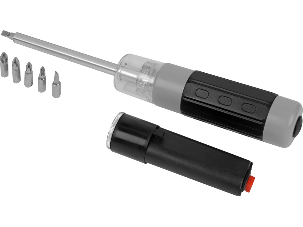 Мультифункциональный инструмент с фонариком. Многофункциональный инструмент с магнитным выдвижным крюком и вставным фонариком. В комплекте насадки для отверток: PH1, PH2, PZ1, PZ2 и SL4, SL5. Батарейки включены и вставлены. Упакован в коробку STAC. АБС и сталь. Гравировка (оптоволоконный лазер) (Без чернения) на данный товар осуществляется бесплатно. Оплачивается только настройка оборудования в размере 950 рублей на весь тираж.