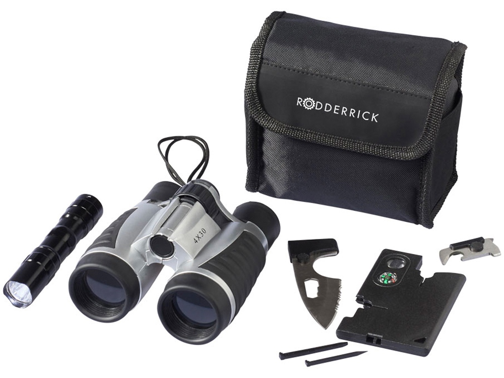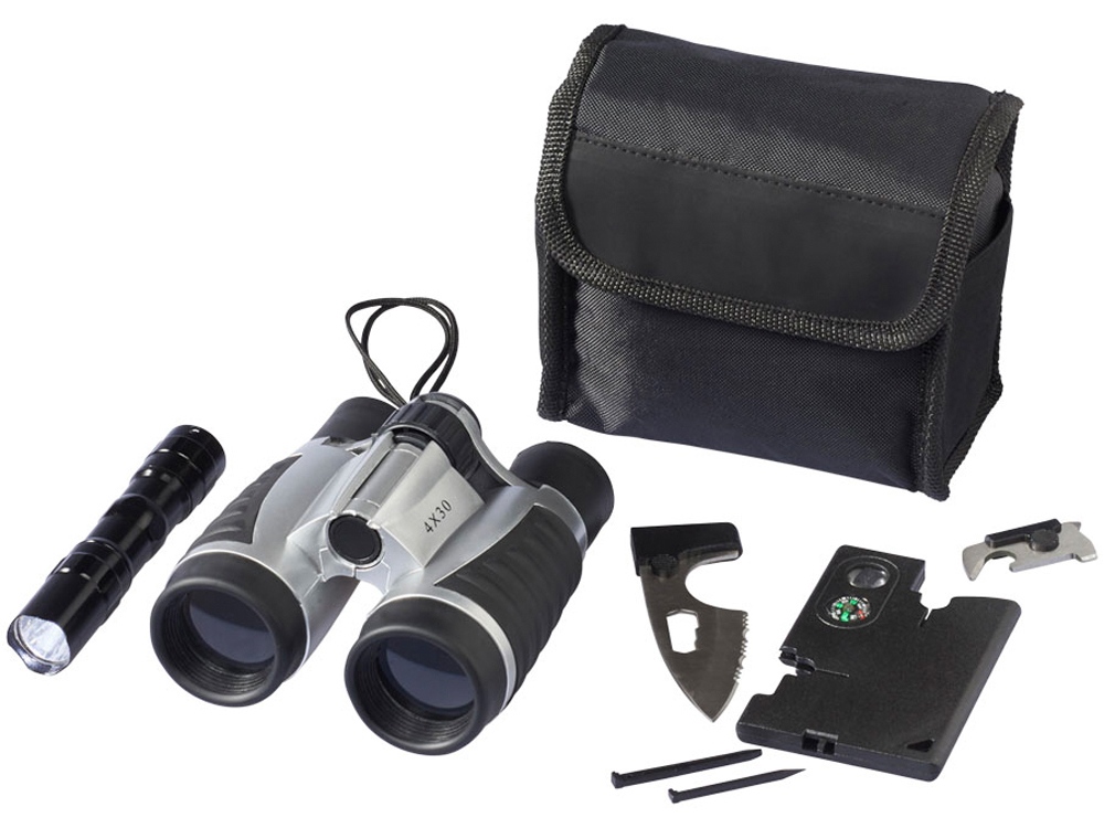 Подарочный набор для активного отдыха Dundee, 16 функций. В набор входит бинокль 4х30 с резиновым грипом, шнурком на шею и чистящая салфетка. В боковом кармане чехла - фонарик и 14-ти функциональная карта - инструмент.