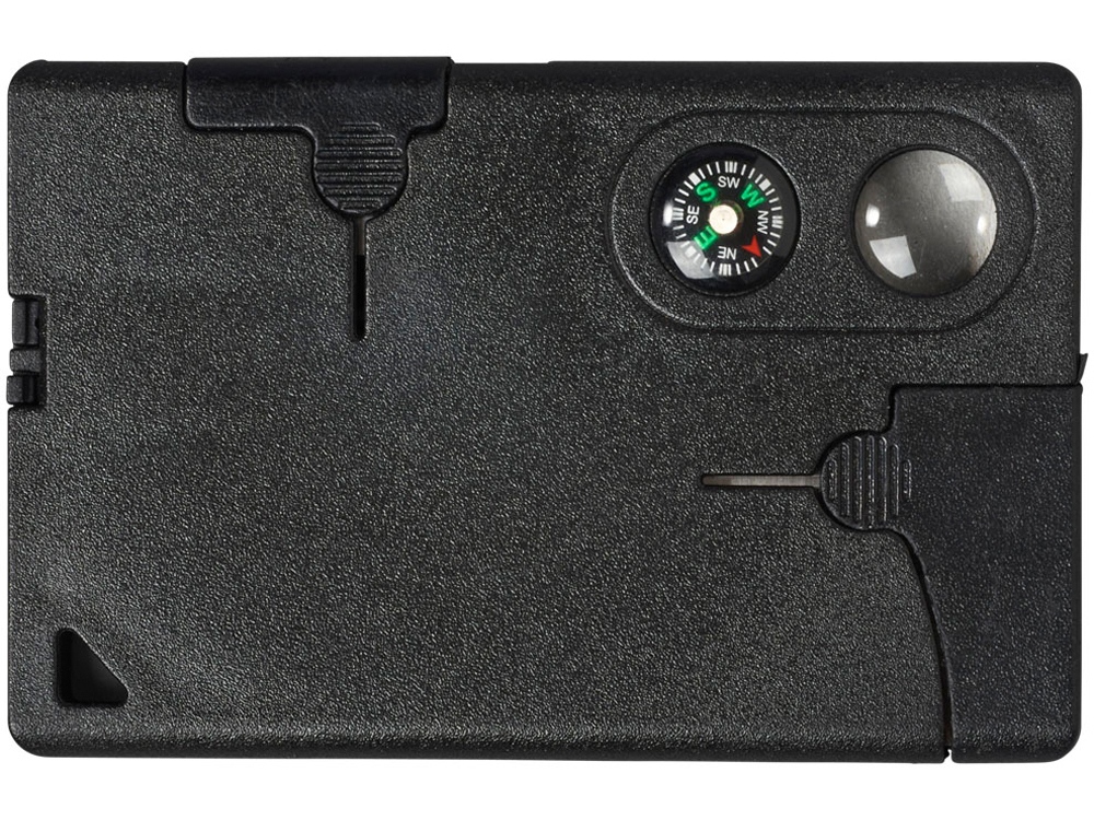 Функции мультикарты следующие: 2 шкалы разных размеров, небольшое отверстие для подвешивания карточки, увеличительное стекло, компас, пилообразный нож, 3 гаечных ключа разных размеров на пилообразном ноже, открывалка для бутылок, 2 отвертки разных размеров на открывалке, зажим (пинцет), зубочистка.