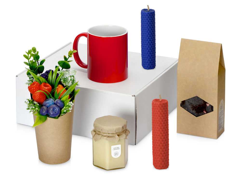 Набор наполнен запахом ягод, ими пахнут и мыло ручной работы, выполненное в виде букета, и чай, а свеча из вощины и крем-мед добавляют к этому аромату нотку медового уюта. Набор состоит из кружки, двух свечей из окрашенной вощины, кружки, крем-меда и пакетика чая, а упаковкой служит белая картонная коробка с наполнителем. Трафаретная печать круговая (1 цвет (цветные изделия)) на данный товар осуществляется бесплатно. Оплачивается только настройка оборудования в размере 6400 рублей на весь тираж. Внимание! Оттенок мёда может незначительно отличаться от партии к партии, т.к. для его изготовления используется разнотравный мед с различных пасек, которые могут находится как вблизи лугов, так и посевов. Сборка набора осуществляется в течение 2-х рабочих дней при наличии на складе.