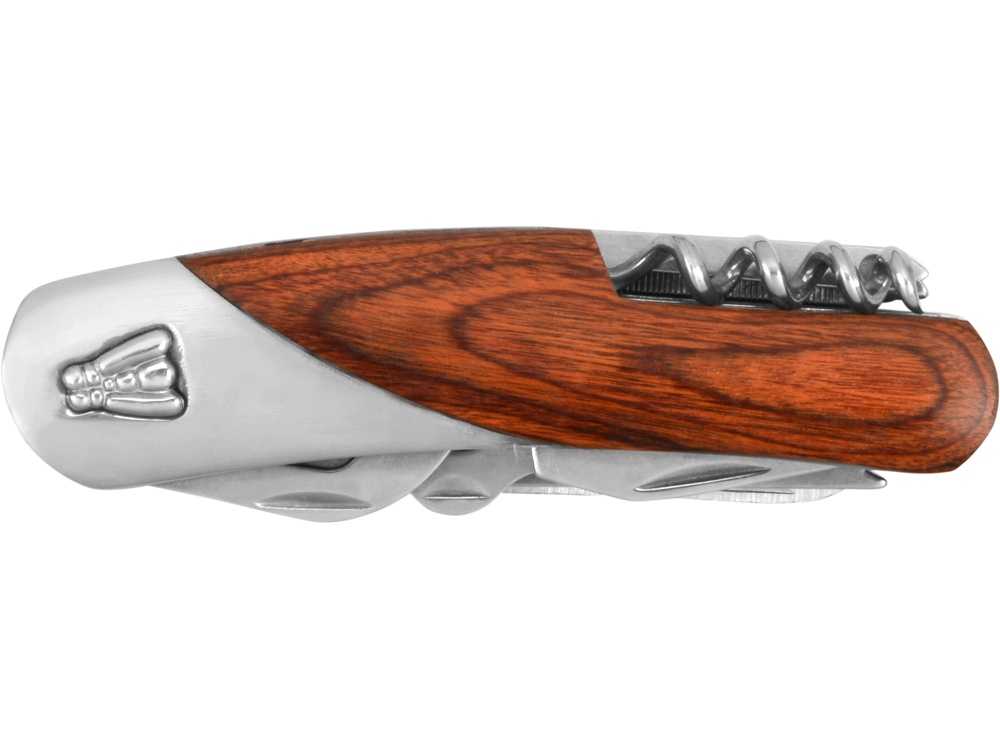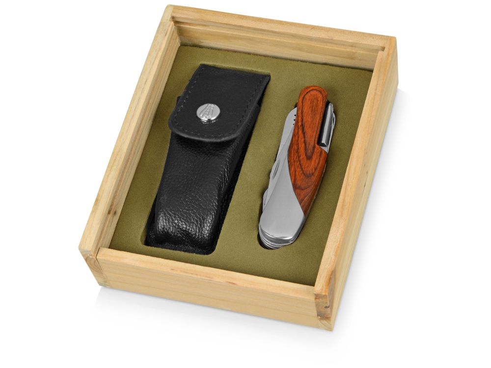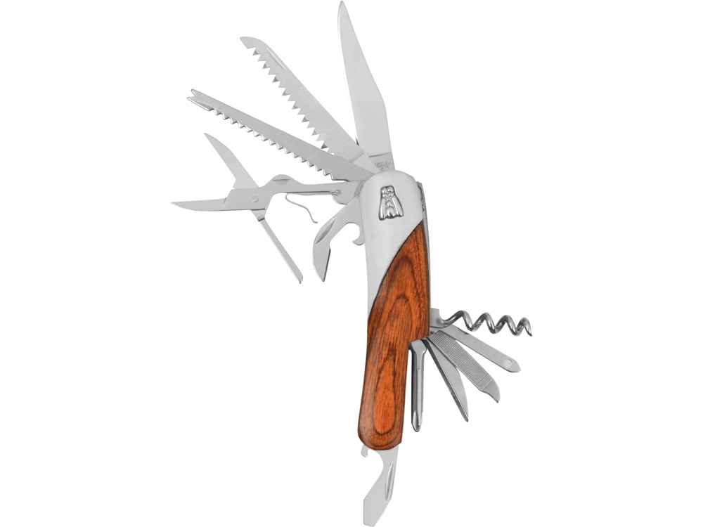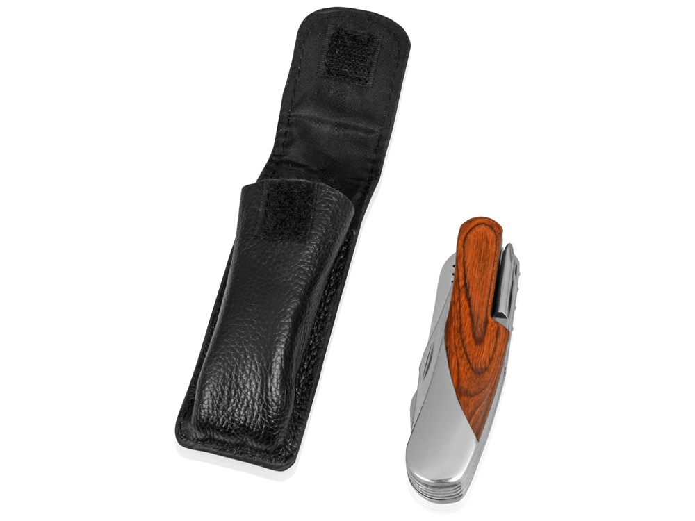 Многофункциональный нож будет отличным подарком любому мужчине. Помимо собственно ножа в наборе штопор, две пилы, маникюрный набор, две открывалки. Полиэстеровый чехол для ношения на поясе прилагается. Упакован в подарочную коробку. Длина ножа в разложенном виде 155мм. Гравировка (оптоволоконный лазер) (Без чернения) на данный товар осуществляется бесплатно. Оплачивается только настройка оборудования в размере 950 рублей на весь тираж.
