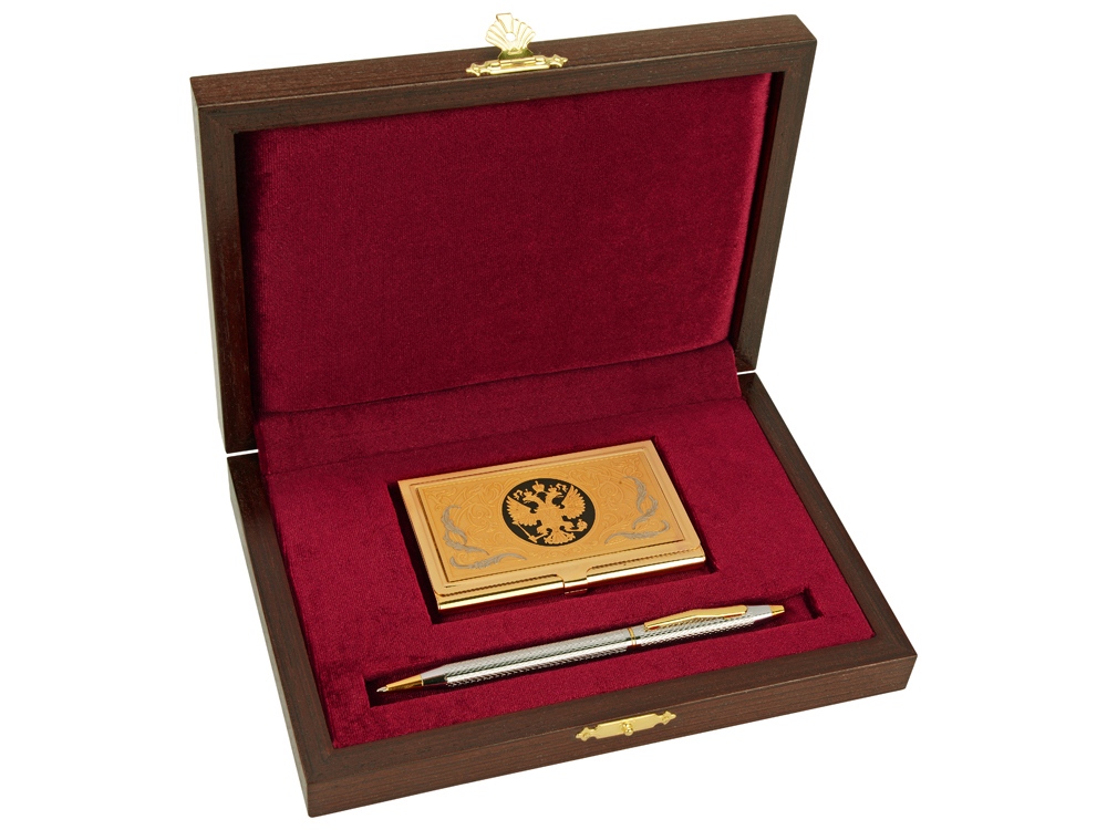 Отличный подарочный набор для руководителей, топ-менеджеров и ключевых клиентов. В набор входит визитница, шариковая ручка и небольшой подарочный футляр. Позолоченная визитница задекорирована изображением российского герба. Внимание, шариковая ручка в наборе может отличаться от представленной на фото.